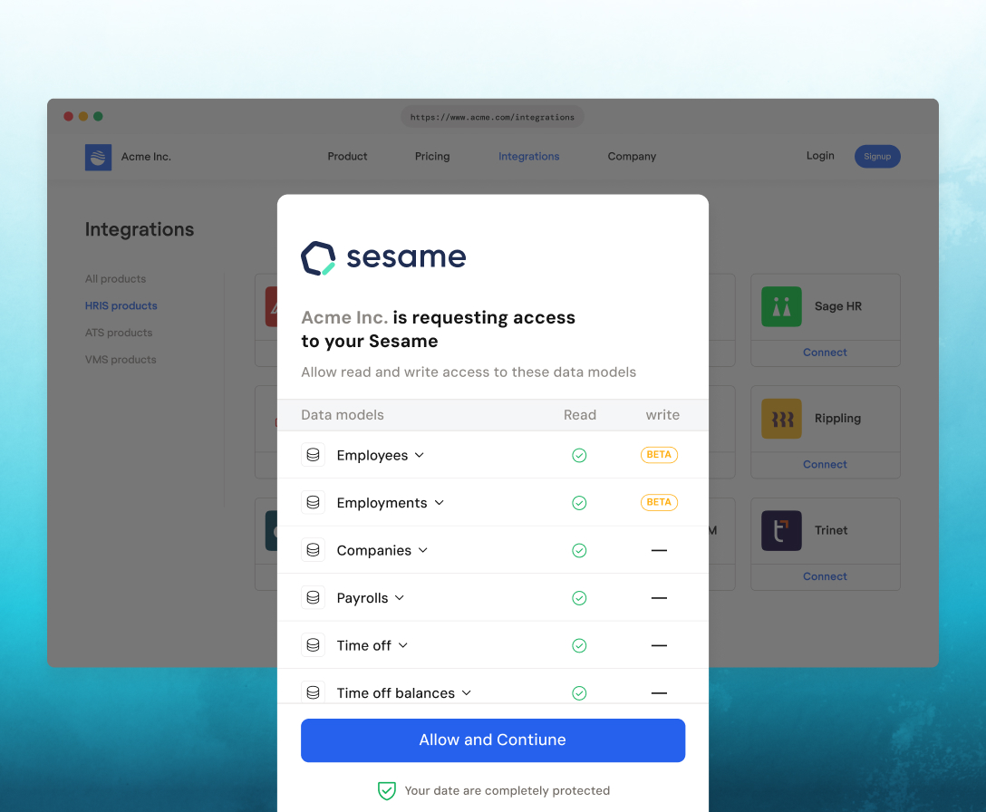 Authenticate via Magic Link—our drop-in auth component. Your customer connects their Sesame HR account in minutes.